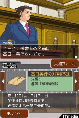 In the DS and 3DS editions of the first four titles, the evidence subscreen differs between the Western and Japanese releases. Such an implementation may seem unusual, as it requires extra code and graphics for all non-Japanese versions. However, as it turns out, this wasn't always the case.