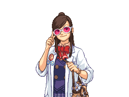 In the earlier sprite, she has a different pose and facial expression. Her hair strand does not cover her left eye, the attorney's badge is missing from the lapel, and the jacket is cut slightly lower than in the final game. It is also worth mentioning that the lighting and shadows are drawn differently compared to the final sprite.
